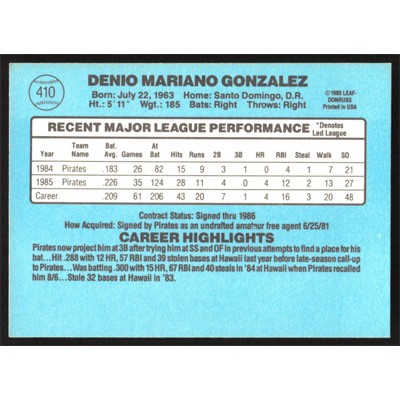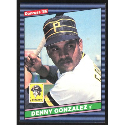 This is a 1986 Donruss Denny Gonzalez baseball card. The card is #410 and pictures show condition.