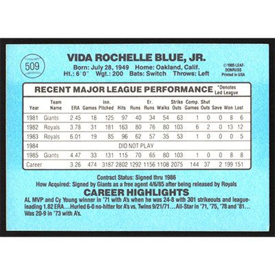 This is a 1986 Donruss Vida Blue baseball card. The card is #509 and pictures show condition.
