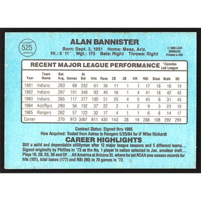 This is a 1986 Donruss Alan Bannister baseball card. The card is #525 and pictures show condition.