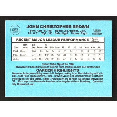 This is a 1986 Donruss Chris Brown baseball card. The card is #553 and pictures show condition.