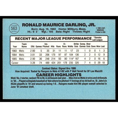 This is a 1986 Donruss Ron Darling baseball card. The card is #563 and pictures show condition.