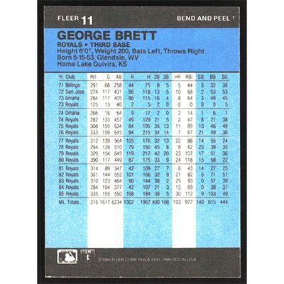 This is a 1986 Fleer Star Stickers George Brett baseball card. The card is #11 and pictures show condition.