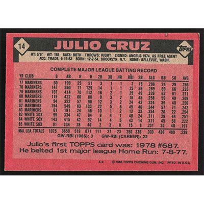 This is a 1986 Topps Julio Cruz baseball card. The card is #14 and pictures show condition.