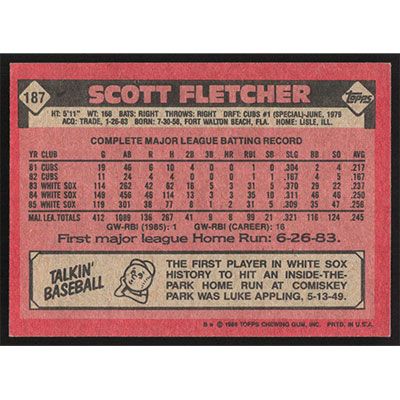 This is a 1986 Topps Scott Fletcher baseball card. The card is #187 and pictures show condition.