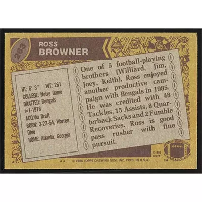 This is a 1986 Topps Ross Browner football card. The card is #263 and pictures show condition.