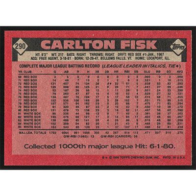 This is a 1986 Topps Carlton Fisk baseball card. The card is #290 and pictures show condition.