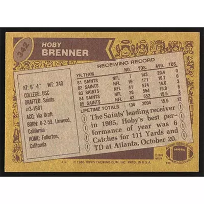 This is a 1986 Topps Hoby Brenner football card. The card is #342 and pictures show condition.