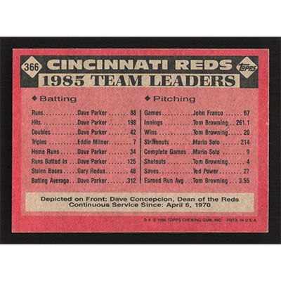 This is a 1986 Topps Dave Concepcion Team Leaders baseball card. The card is #366 and pictures show condition.