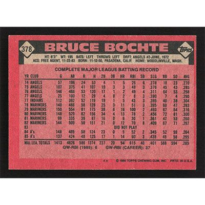 This is a 1986 Topps Bruce Bochte baseball card. The card is #378 and pictures show condition.
