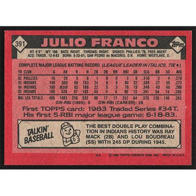 This is a 1986 Topps Julio Franco baseball card. The card is #391 and pictures show condition.