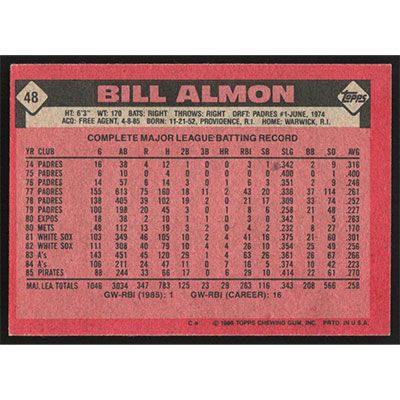 This is a 1986 Topps Bill Almon baseball card. The card is #48 and pictures show condition.