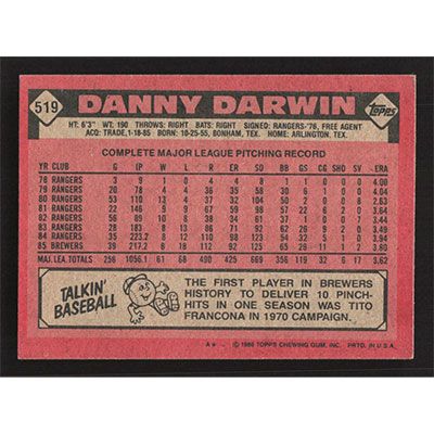 This is a 1986 Topps Danny Darwin baseball card. The card is #519 and pictures show condition.