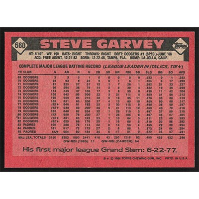 This is a 1986 Topps Steve Garvey baseball card. The card is #660 and pictures show condition.