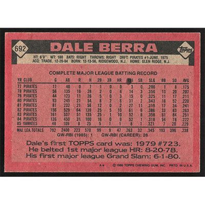 This is a 1986 Topps Dale Berra baseball card. The card is #692 and pictures show condition.
