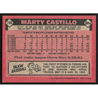 This is a 1986 Topps Marty Castillo baseball card. The card is #788 and pictures show condition.