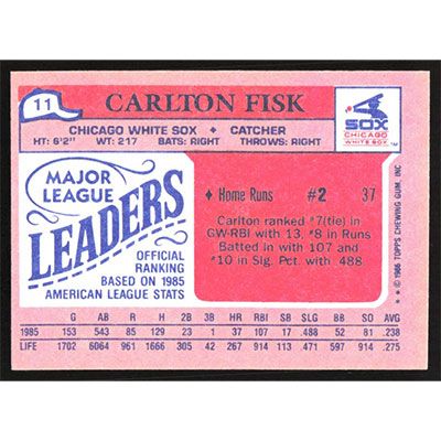 This is a 1986 Topps Mini Leaders Carlton Fisk baseball card. The card is #11 and pictures show condition.