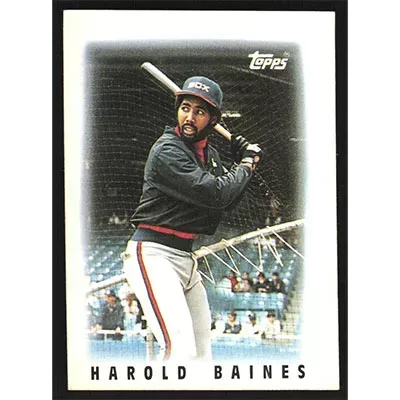 This is a 1986 Topps Mini Leaders Harold Baines baseball card. The card is #8 and pictures show condition.