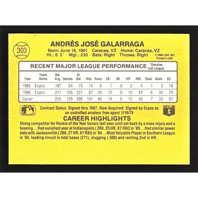 This is a 1987 Donruss Andres Galarraga baseball card. The card is #303 and pictures show condition.