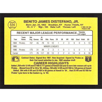 This is a 1987 Donruss Benny Distefano baseball card. The card is #514 and pictures show condition.