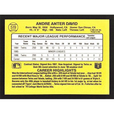 This is a 1987 Donruss Andre David baseball card. The card is #519 and pictures show condition.