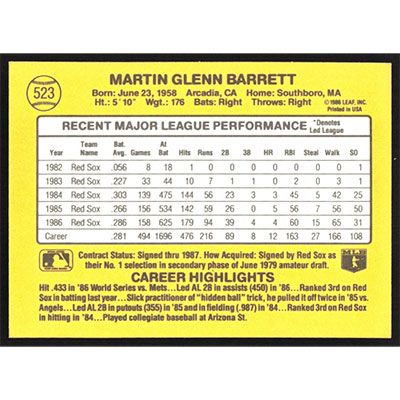 This is a 1987 Donruss Marty Barrett baseball card. The card is #523 and pictures show condition.