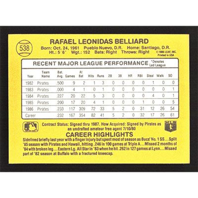 This is a 1987 Donruss Rafael Belliard baseball card. The card is #538 and pictures show condition.