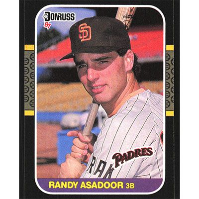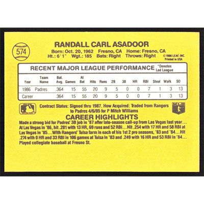 This is a 1987 Donruss Randy Asadoor baseball card. The card is #574 and pictures show condition.