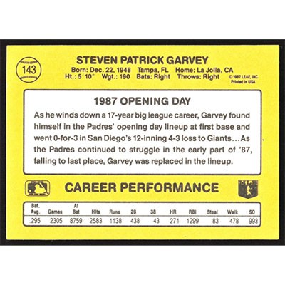 This is a 1987 Donruss Opening Day Steve Garvey baseball card. The card is #143 and pictures show condition.