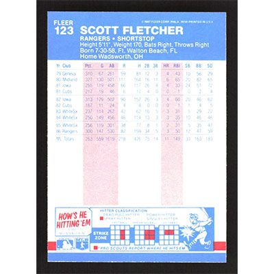 This is a 1987 Fleer Scott Fletcher baseball card. The card is #123 and pictures show condition.