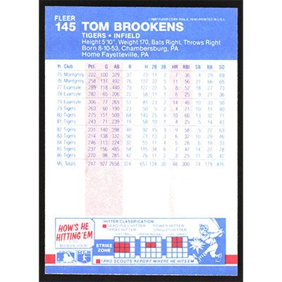 This is a 1987 Fleer Tom Brookens baseball card. The card is #145 and pictures show condition.