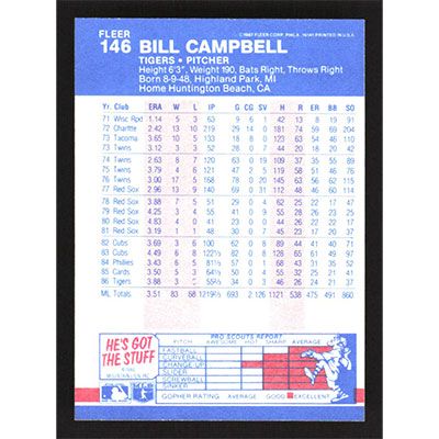 This is a 1987 Fleer Bill Campbell baseball card. The card is #146 and pictures show condition.