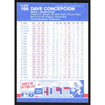 This is a 1987 Fleer Dave Concepcion baseball card. The card is #196 and pictures show condition.