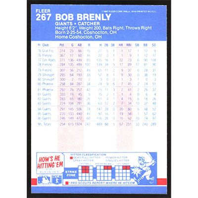 This is a 1987 Fleer Bob Brenly baseball card. The card is #267 and pictures show condition.