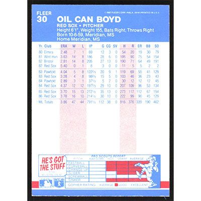 This is a 1987 Fleer Oil Can Boyd baseball card. The card is #30 and pictures show condition.