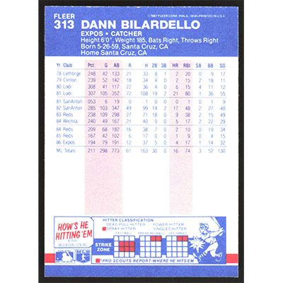 This is a 1987 Fleer Dann Bilardello baseball card. The card is #313 and pictures show condition.