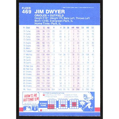This is a 1987 Fleer Jim Dwyer baseball card. The card is #469 and pictures show condition.