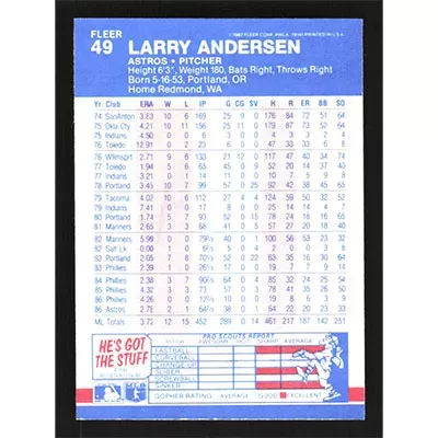 This is a 1987 Fleer Larry Andersen baseball card. The card is #49 and pictures show condition.
