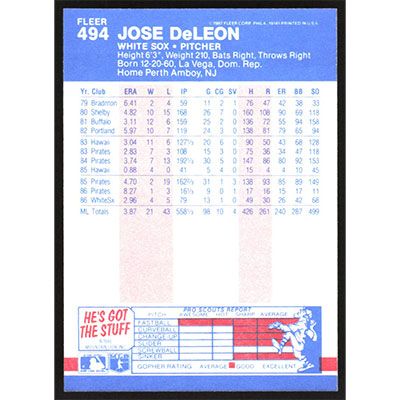 This is a 1987 Fleer Jose DeLeon baseball card. The card is #494 and pictures show condition.