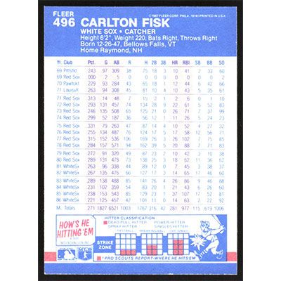 This is a 1987 Fleer Carlton Fisk baseball card. The card is #496 and pictures show condition.