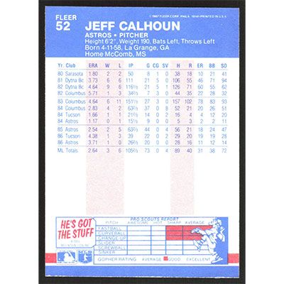 This is a 1987 Fleer Jeff Calhoun baseball card. The card is #52 and pictures show condition.
