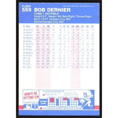 This is a 1987 Fleer Bob Dernier baseball card. The card is #559 and pictures show condition.