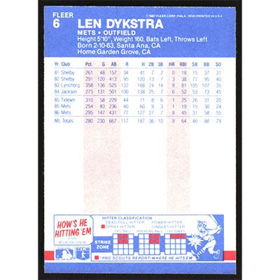 This is a 1987 Fleer Len Dykstra baseball card. The card is #6 and pictures show condition.