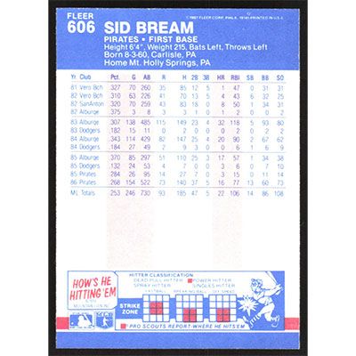 This is a 1987 Fleer Sid Bream baseball card. The card is #606 and pictures show condition.