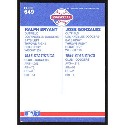 This is a 1987 Fleer Ralph Bryant and Jose Gonzalez Prospects baseball card. The card is #649 and pictures show condition. Team(s): Los Angeles Dodgers Rookie Card (RC)