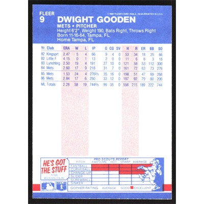 This is a 1987 Fleer Dwight Gooden baseball card. The card is #9 and pictures show condition.