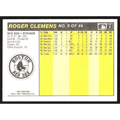 This is a 1987 Fleer Award Winners Roger Clemens baseball card. The card is #9 and pictures show condition.