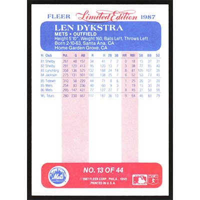 This is a 1987 Fleer Limited Edition Len Dykstra baseball card. The card is #13 and pictures show condition.
