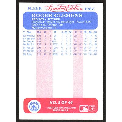 This is a 1987 Fleer Limited Edition Roger Clemens baseball card. The card is #9 and pictures show condition.