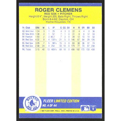 This is a 1987 Fleer Record Setters Roger Clemens baseball card. The card is #4 and pictures show condition.