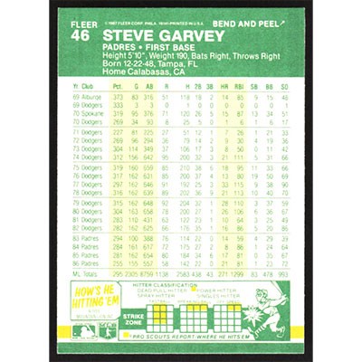 This is a 1987 Fleer Star Stickers Steve Garvey baseball card. The card is #46 and pictures show condition.